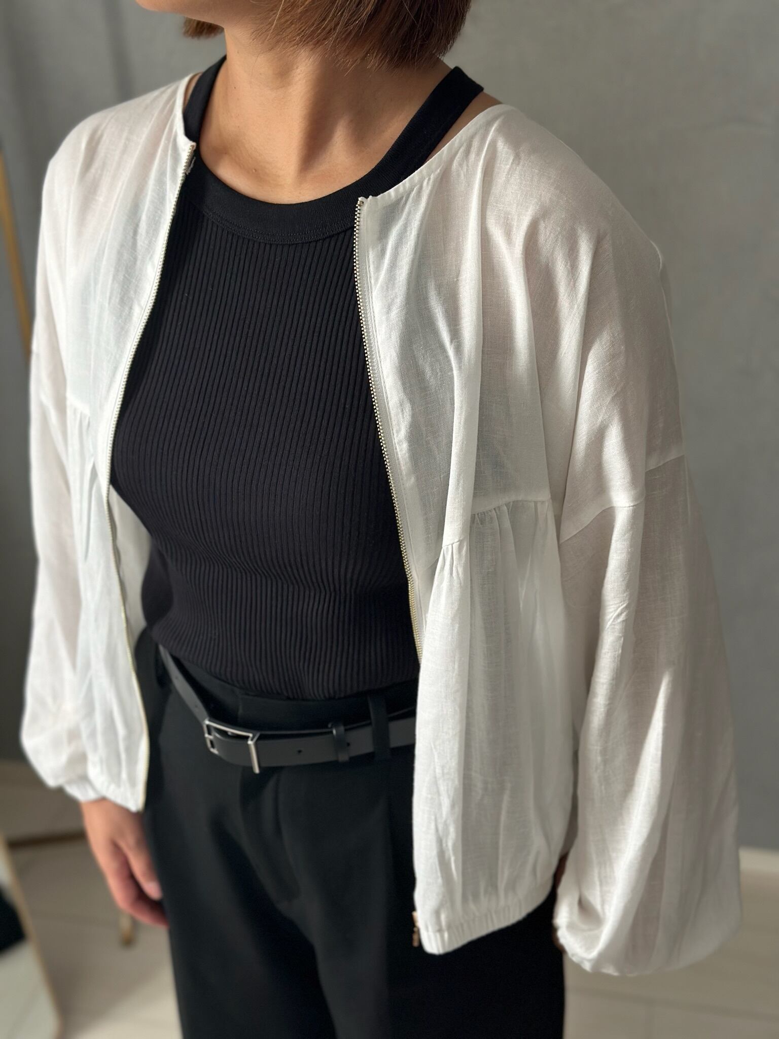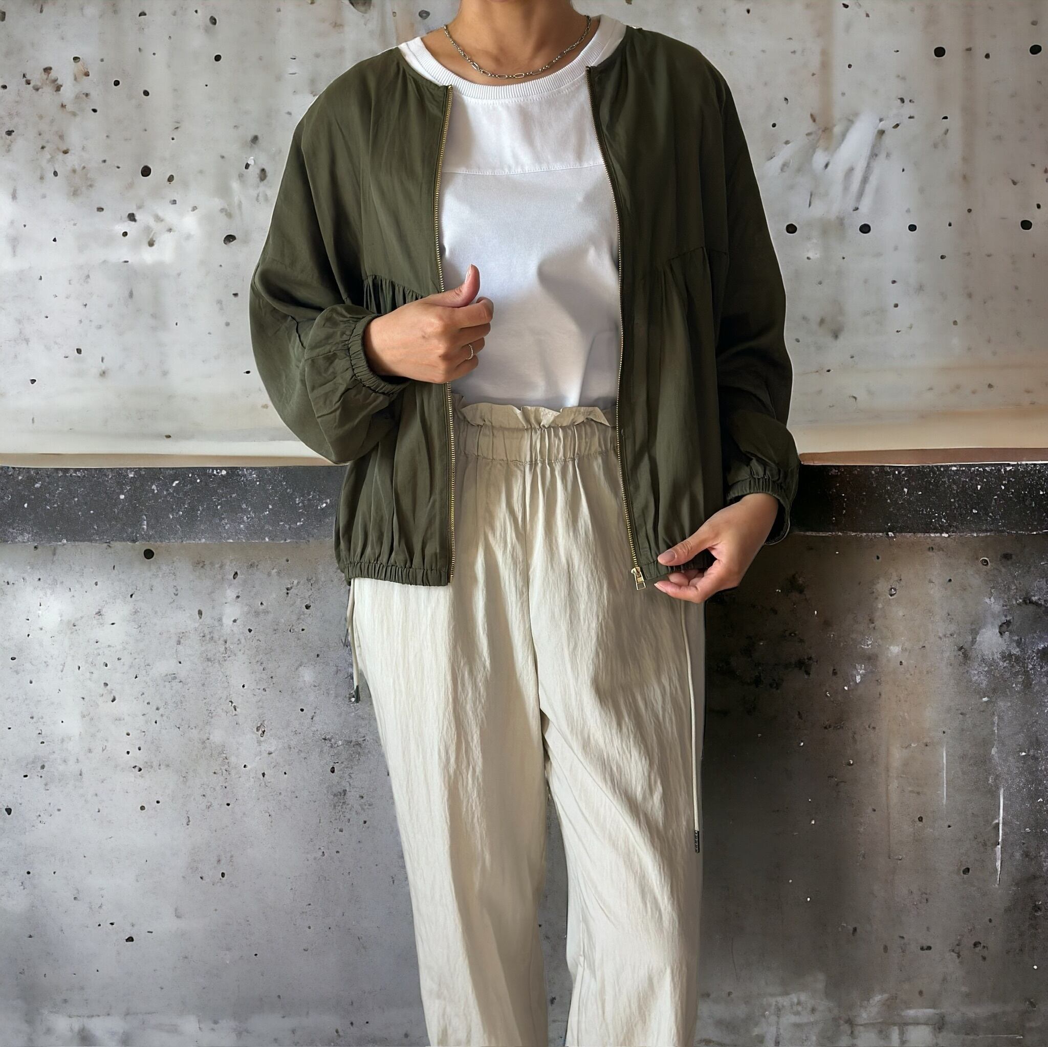 程よい透け感と落ち感がある、麻混素材のギャザーブルゾン。