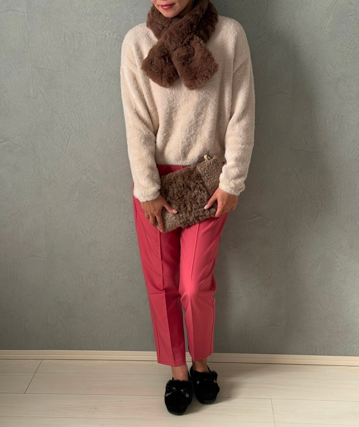 ショルダー長さは調節可能でファーの位置も変えられます。